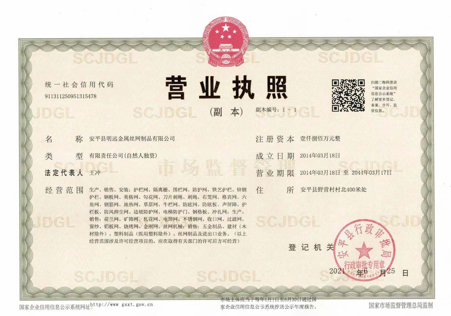 安平縣明遠金屬絲網(wǎng)制品有限公司 - 座落于絲網(wǎng)產業(yè)基地河北安平,二十年絲網(wǎng)制作經驗,是一家從拔絲、焊接、打砂、折彎、鍍鋅、噴塑、浸塑、為成品,生產研發(fā)安裝為一體的交通工程護欄網(wǎng)、光伏景區(qū)圍欄網(wǎng)專業(yè)型企業(yè)。明遠公司擁有先進的生產設備,全自動浸塑、噴塑、鍍鋅生產線,電腦焊網(wǎng)機組,聯(lián)合壓力機,數(shù)控折彎機,槍尖沖孔機等多臺輔助設備,具有大批量生產能力。